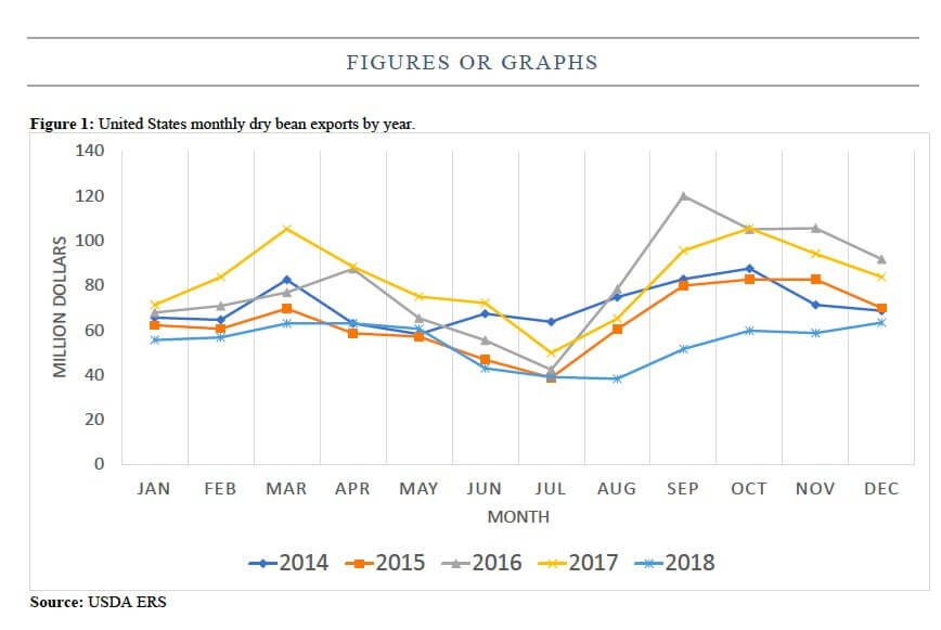 A USDBC commissioned study from North Dakota State University’s (NDSU) Center for Agricultural Policy & Trade Studies Agribusiness and Applied Economics concluded that EU retaliatory tariffs have put U.S. farmers at a price disadvantage in international markets, resulting in reduced exports and potentially lost export markets in the future.   The study looked at the impact of tariffs on the three principal types of dry beans exported to the EU; Dark Red Kidney (DRK), Navy, and Great Northern (GN). NDSU researchers concluded that tariff levels must reach an inflection point, or key level, before export amounts are negatively impacted. Specifically, for DRK, the inflection point, or key level is at 21.01% tariff rate. When tariffs exceed 21%, a 1% increase in tariffs will lead to a 17.21% decline in export volume. For GNs, the inflection point is at 16.31% tariffs. A 1% increase in tariffs, above 16.3%, will lead to a 11.33% decline in export volume. Finally, for Navy beans, the inflection point is 84.98% tariff rate. A 1% increase in tariffs, above 85%, will lead to 7.05% decline export volumes.